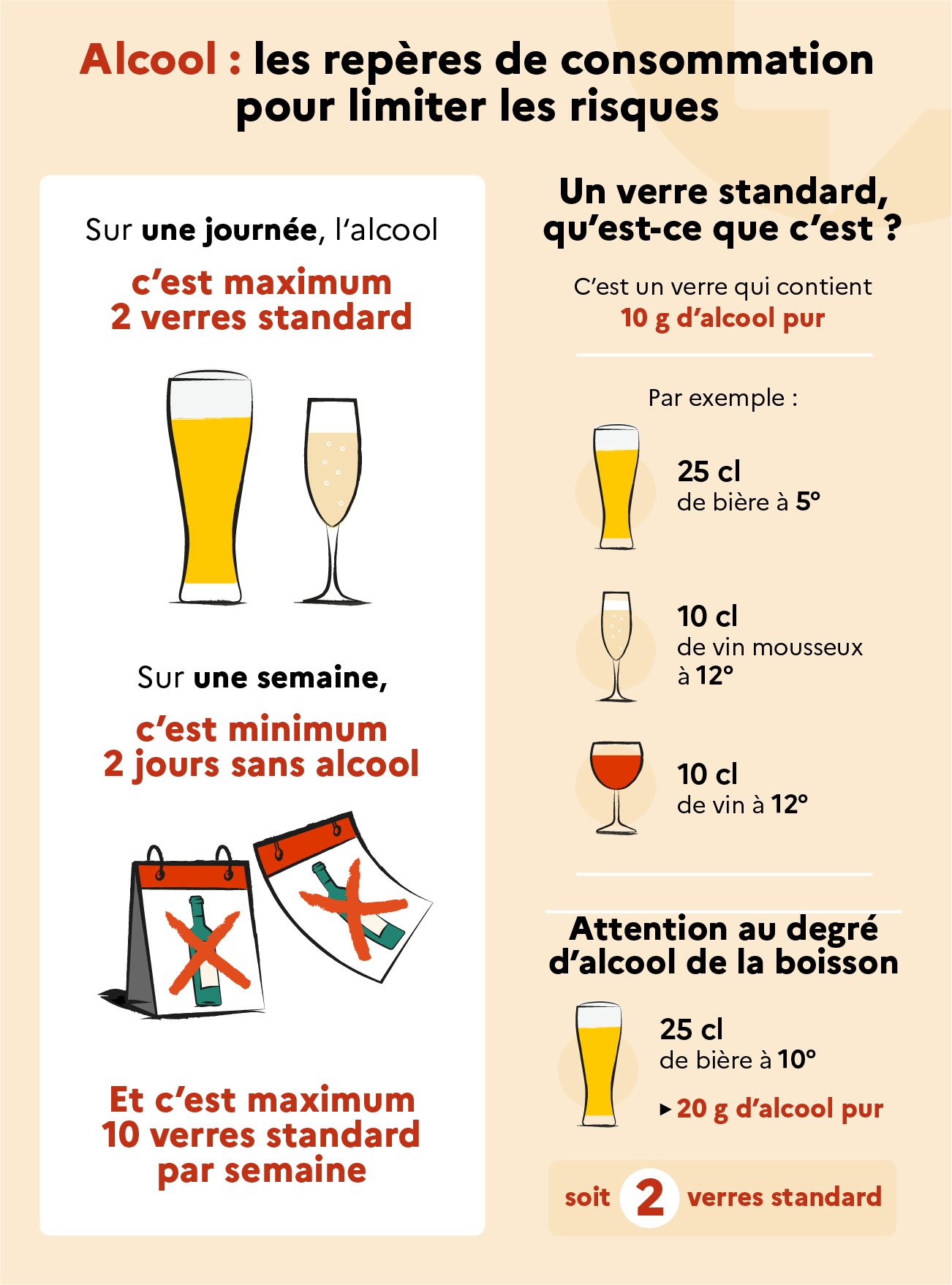 Santé publique France met en avant que « les risques pour la santé d’une consommation d’alcool existent dès le premier verre quotidien ». Les repères de consommation à moindre risque, actualisés par un groupe d’experts*, sont désormais :