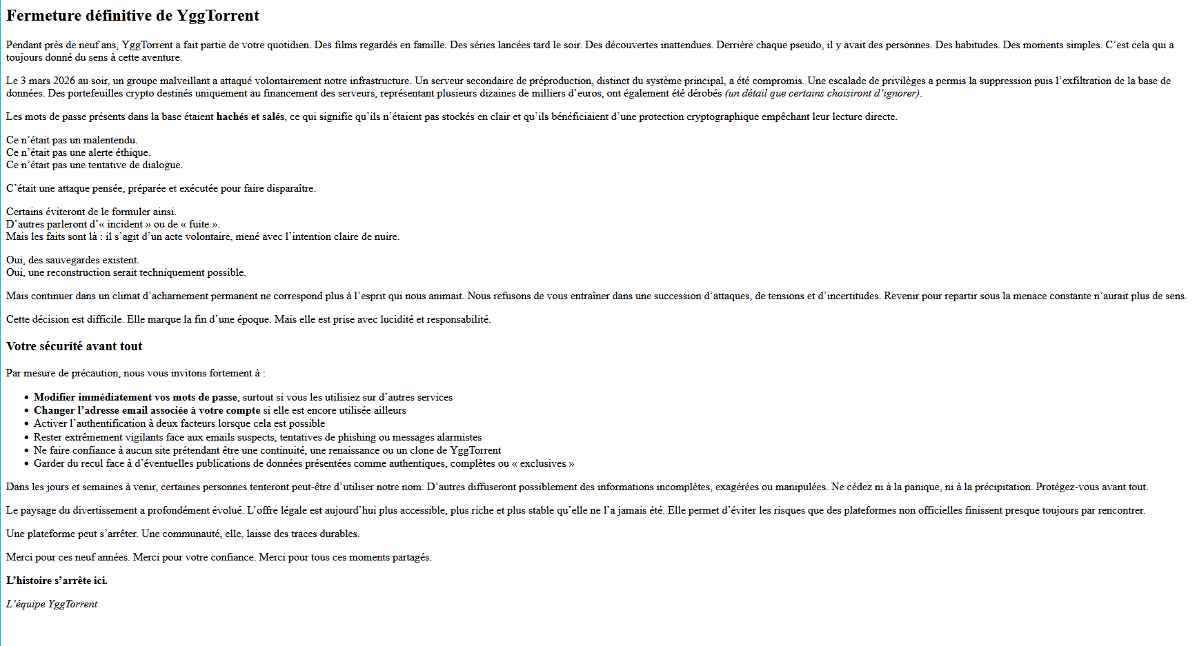 Pendant près de neuf ans, YggTorrent a fait partie de votre quotidien. Des films regardés en famille. Des séries lancées tard le soir. Des découvertes inattendues. Derrière chaque pseudo, il y avait des personnes. Des habitudes. Des moments simples. C’est cela qui a toujours donné du sens à cette aventure.Le 3 mars 2026 au soir, un groupe malveillant a attaqué volontairement notre infrastructure. Un serveur secondaire de préproduction, distinct du système principal, a été compromis. Une escalade de privilèges a permis la suppression puis l’exfiltration de la base de données. Des portefeuilles crypto destinés uniquement au financement des serveurs, représentant plusieurs dizaines de milliers d’euros, ont également été dérobés (un détail que certains choisiront d’ignorer).