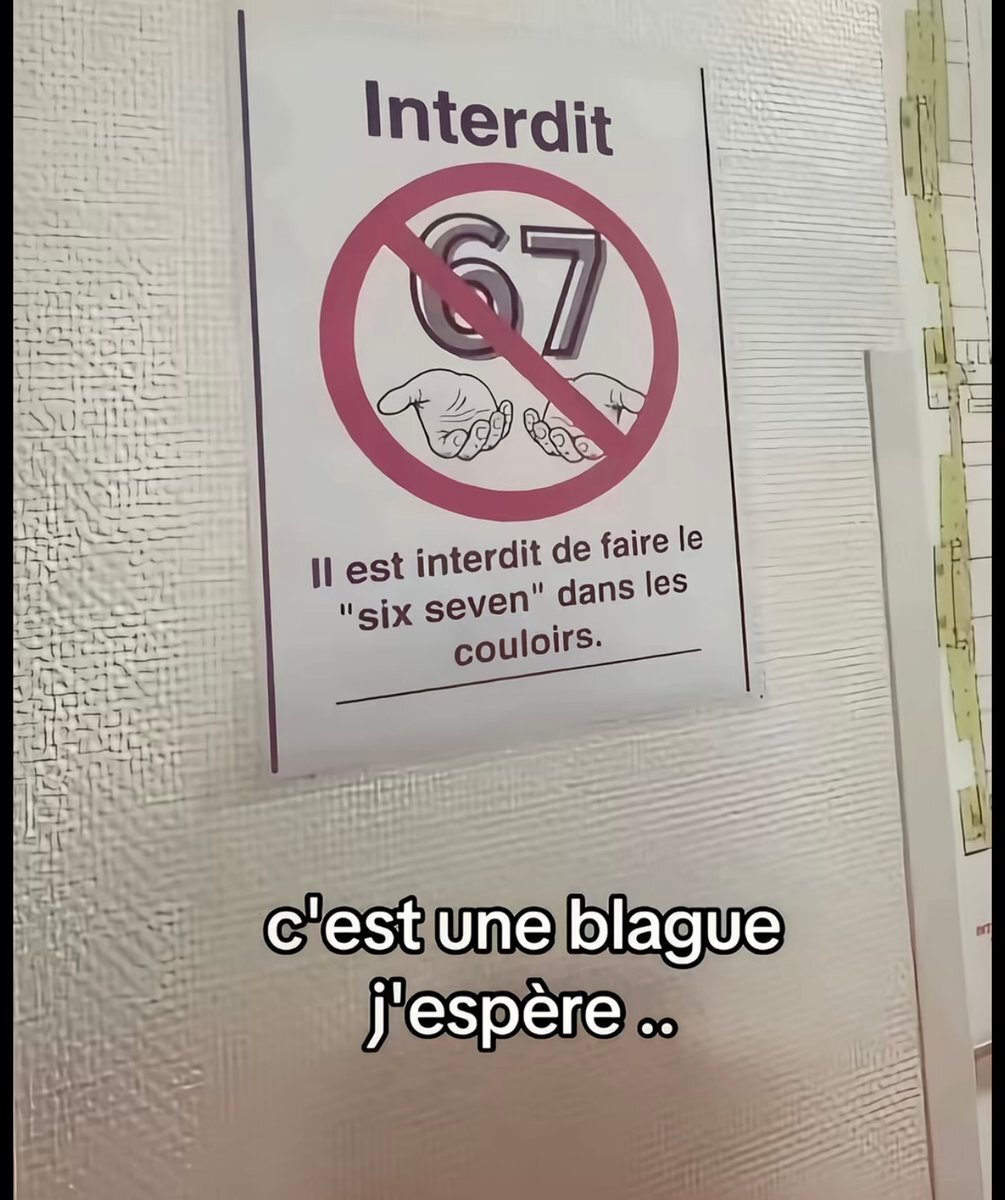 🇫🇷✋✋ INSOLITE | Une affiche « 67 interdit » a été installée dans un établissement scolaire, interdisant désormais aux élèves d’effectuer ce geste viral dans les couloirs. Un phénomène né en 2024 avec le morceau Doot Doot du rappeur Skrilla, en référence à la 67e rue.
