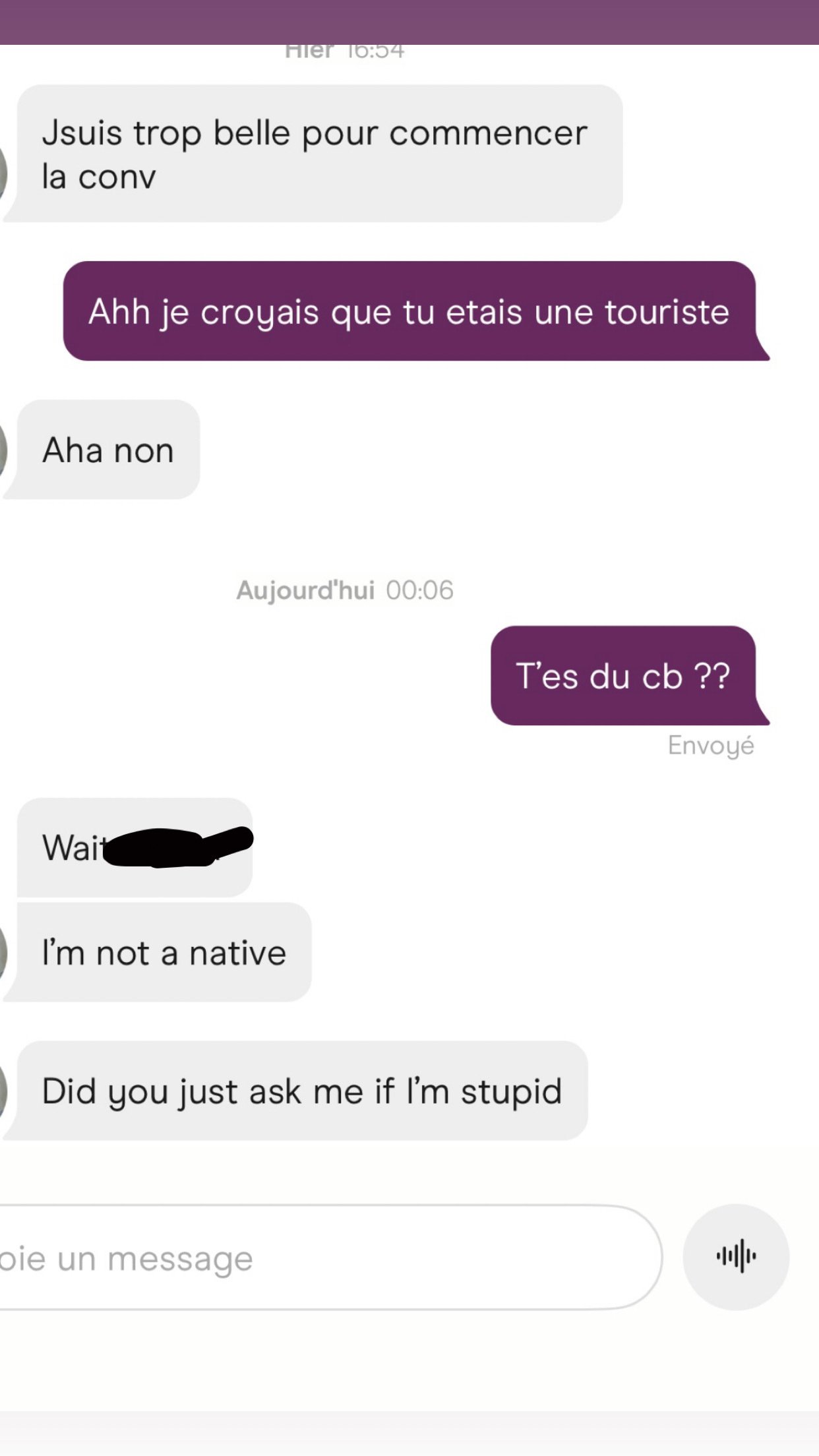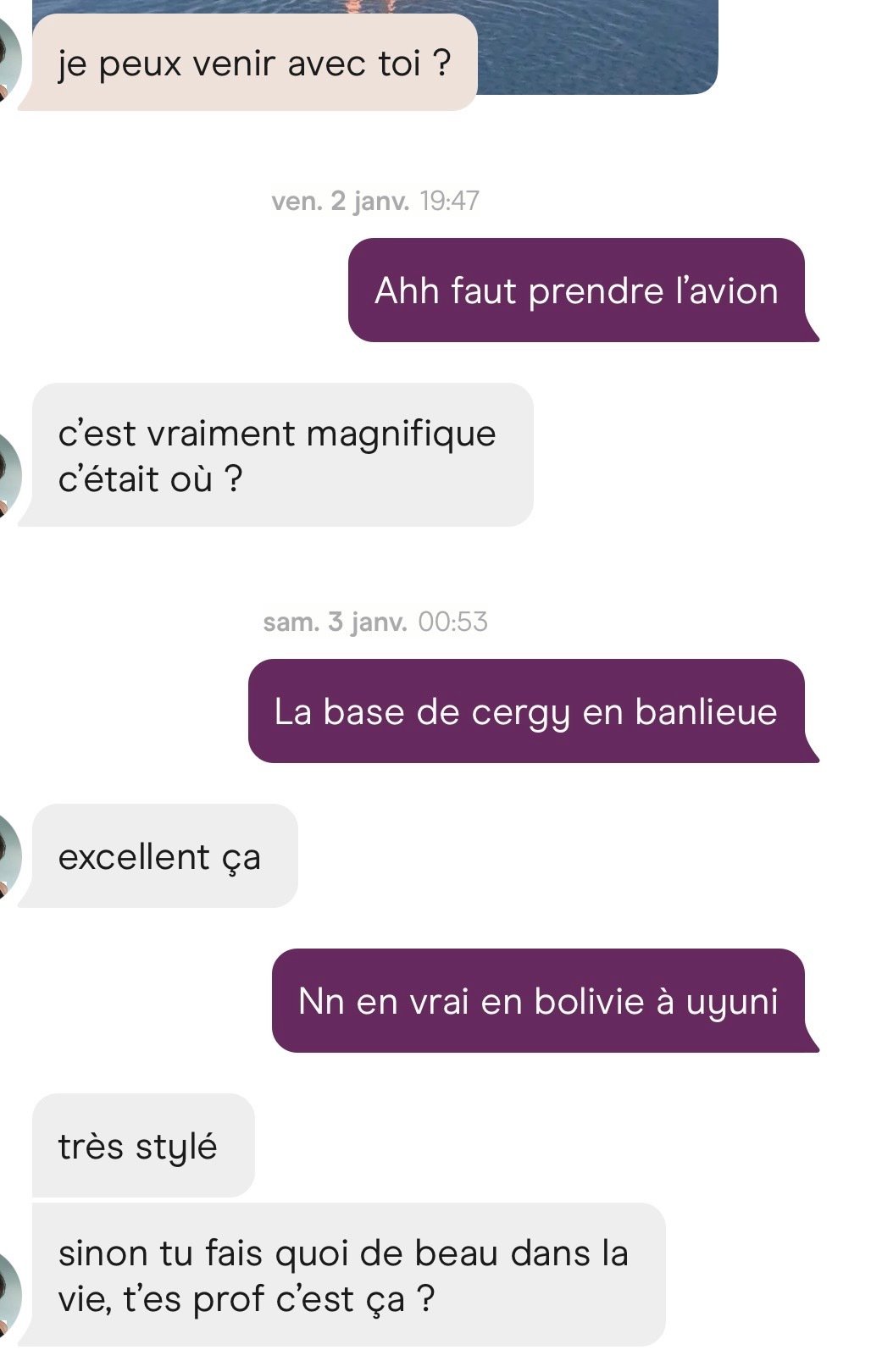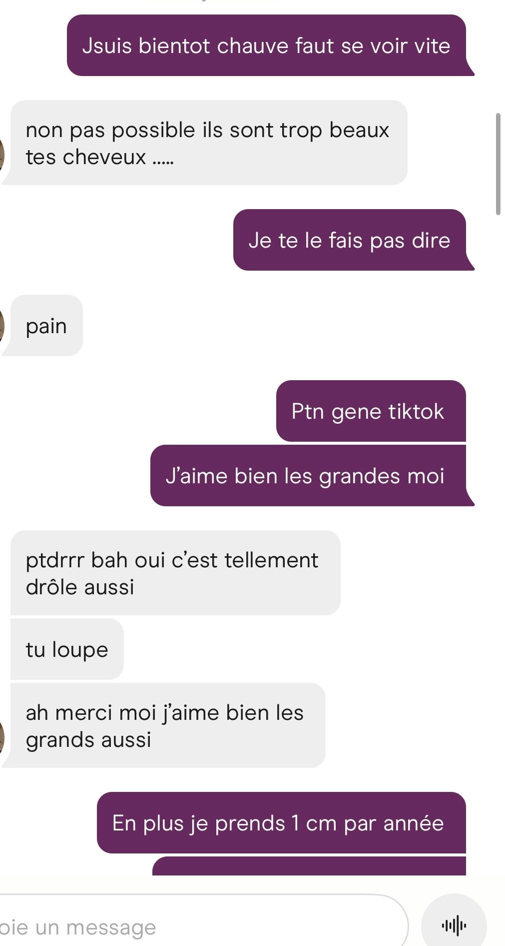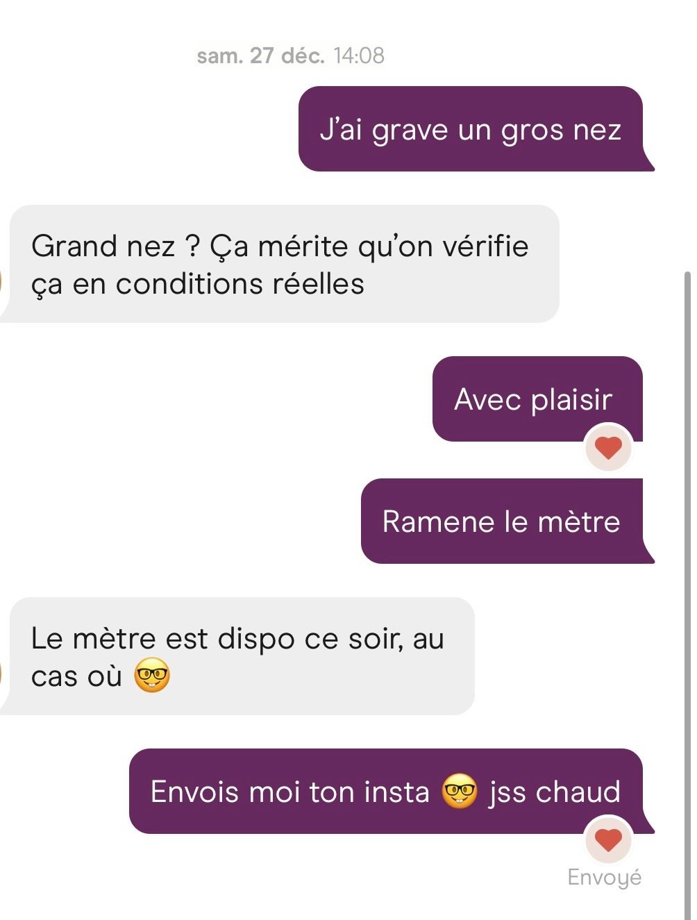 Après faut pas se leurrer, sur les applis on prend ce qu'on nous donne, les 30 9/10 qu'on a liké, il y a pas de réponse ou c'est froid quand ça match![]()