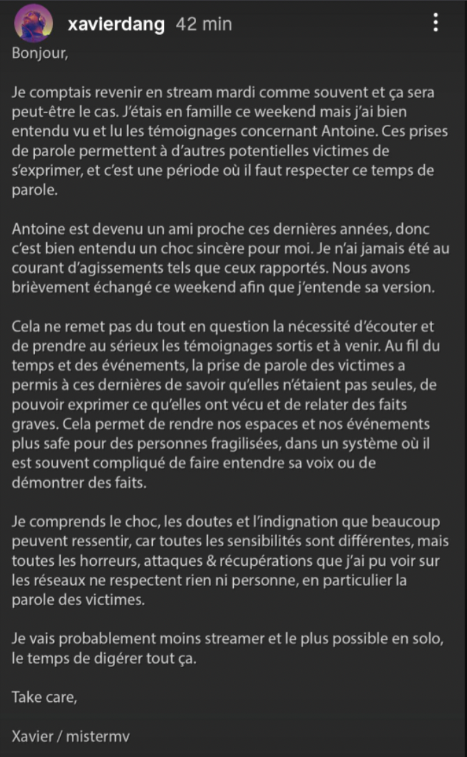 Outre le faite que le reddit et discord soient à fond derrière antoine daniel et refusent de croire les victimes, si on ajoute ces prises de paroles à ceux de mynthos, étoile ce soir en live, horty et avamind, ça sent pas bon pour antoine
