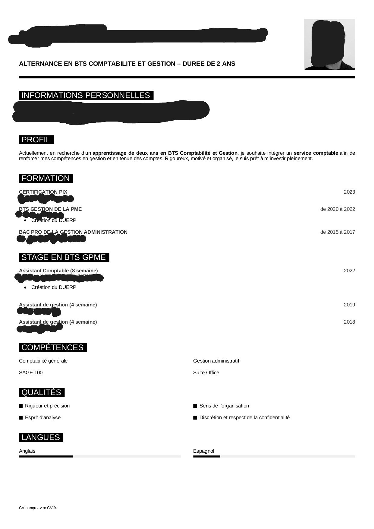 Dans "compétences" justement, beaucoup de compétences pour... rien vu que tu n'as pas d'XP. Sois juste honnête, enlève au moins les 3/4 parce qu'en plus de lancer du bullshit clair, tu te répètes. Comptabilité, point. Pas "compta client, compta fournisseur, compta XXX"