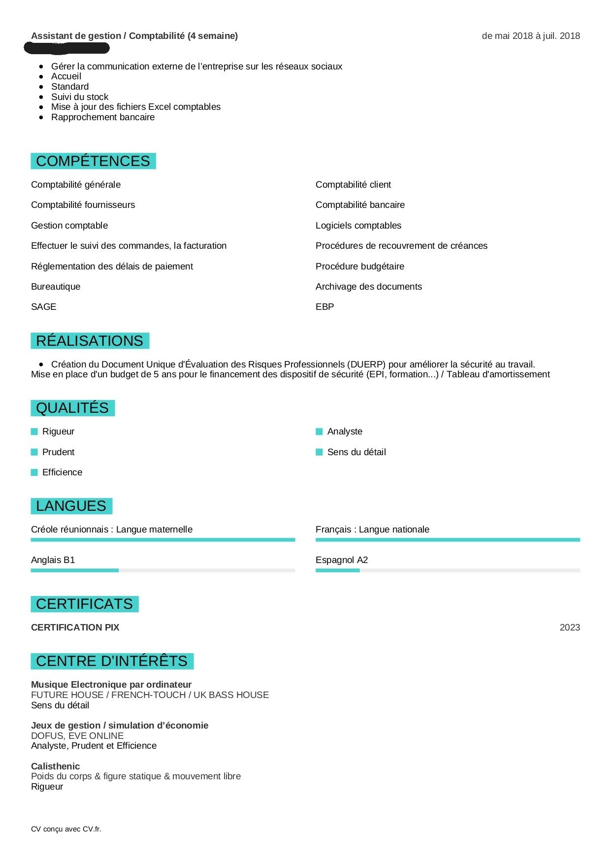 Pas de barres de compétences, ça veut absolument rien dire. Anglais B1, point barreDans "compétences" justement, beaucoup de compétences pour... rien vu que tu n'as pas d'XP. Sois juste honnête, enlève au moins les 3/4 parce qu'en plus de lancer du bullshit clair, tu te répètes. Comptabilité, point. Pas "compta client, compta fournisseur, compta XXX"