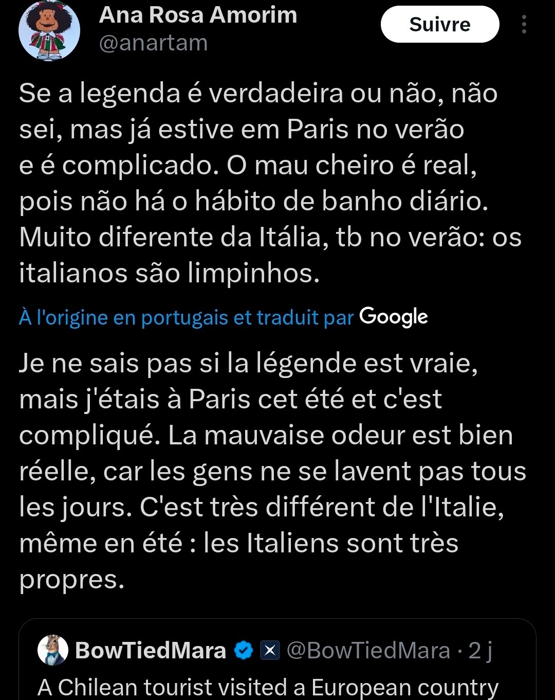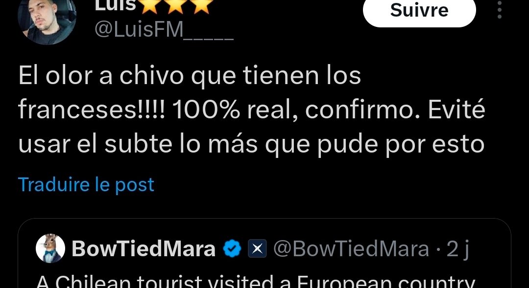 3. Les odeurs corporelles peuvent sentir différent de pays en pays selon les régimes alimentaires etc, génétique etc, je DOUTE que la france est moins hygiénique que le chili