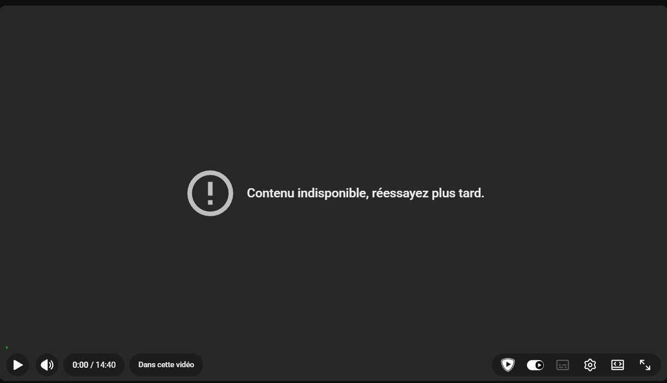 Non, j'ai la même sur certaines vidéos, je me demande si ça a à voir avec l'interdiction de YT en Russie aujourd'hui...ps: je suis sur firefox