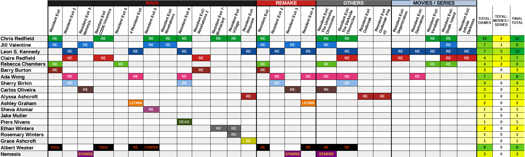 C'est ça khey. Mais pour une raison inconnue, Capcom force avec Chris. Alors que Leon, Claire et Barry sont les persos les plus appréciés mais ils ont peu d'apparition, surtout comparé à Chris.