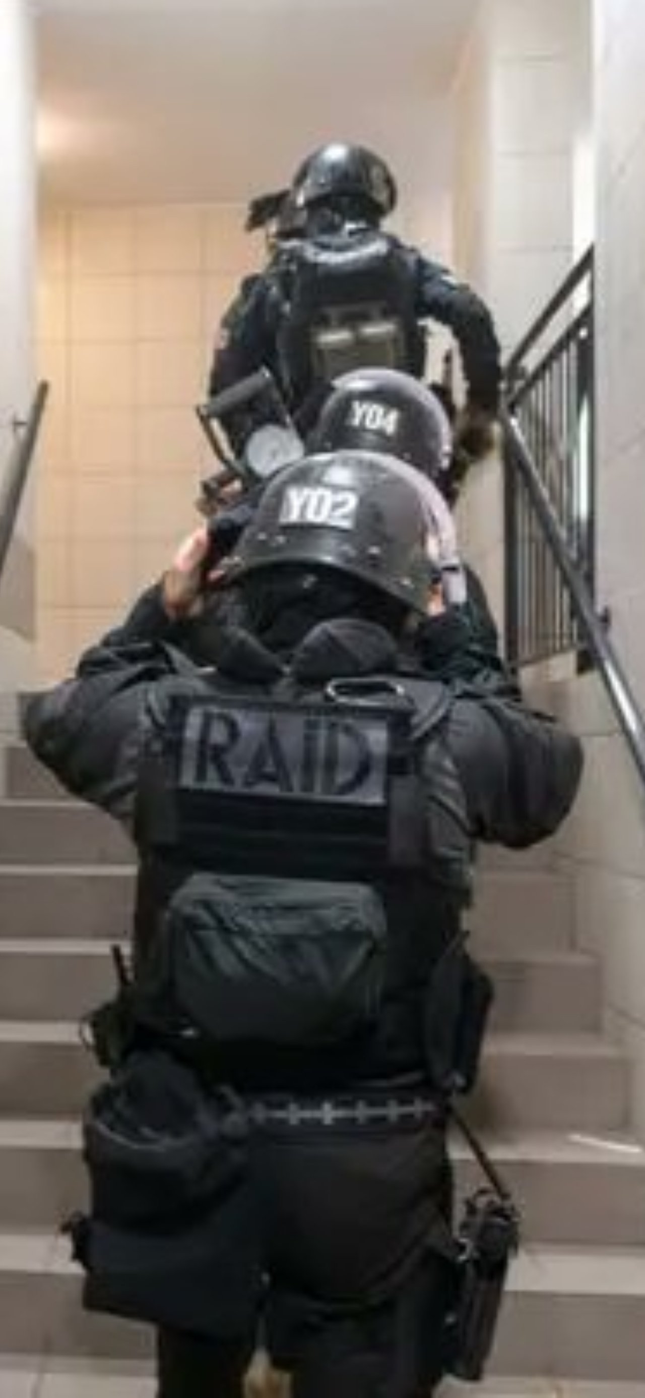 Avec leur casque, leur tenue bleue foncée voire noire