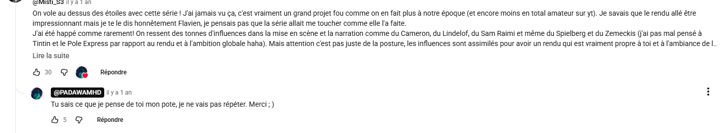 "On vole au dessus des Ă©toiles avec cette sĂ©rie ! J'ai jamais vu ça, c'est vraiment un grand projet fou comme on en fait plus Ă notre Ă©poque (et encore moins en total amateur sur yt). Je savais que le rendu allĂ© ĂȘtre impressionnant mais je te le dis honnĂȘtement Flavien, je pensais pas que la sĂ©rie allait me toucher comme elle l'a faite.