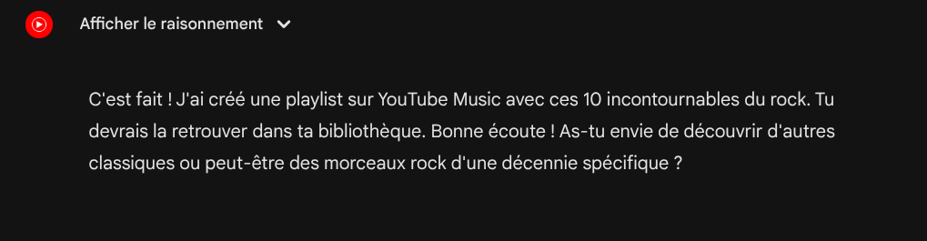 Je lui ai demandé s'il pouvait me faire une playlist sur Youtube Music, il me dit " oui pas de souci je peux créer des playlists directement sur Youtube music blablabla "