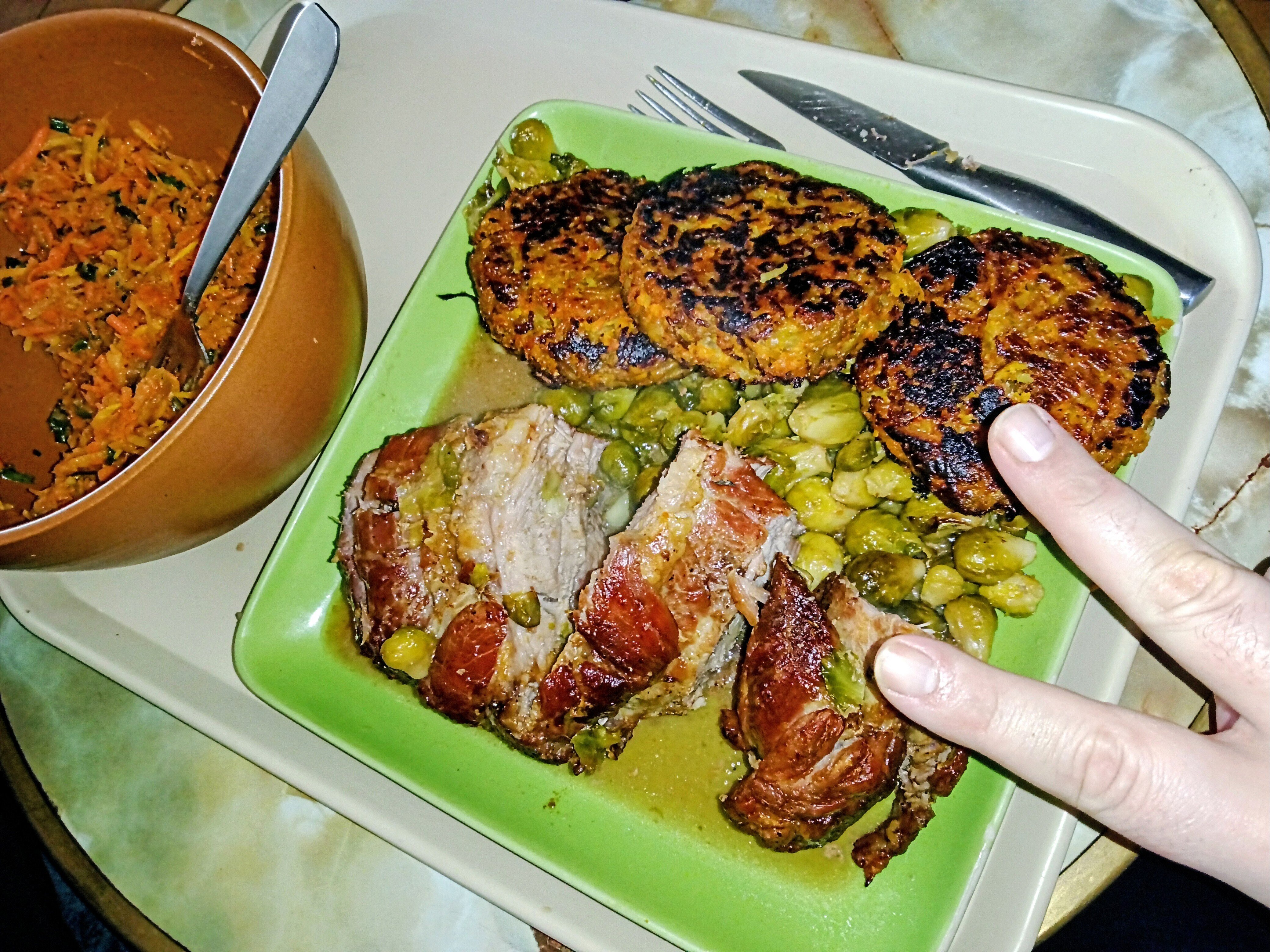 Choux de Bruxelles du jardin, rôti de porc fermier, carottes râpées bio et poire de terre râpées du jardin + ail tripettes du jardin, galette de pomme de terre / potiron du jardin etc