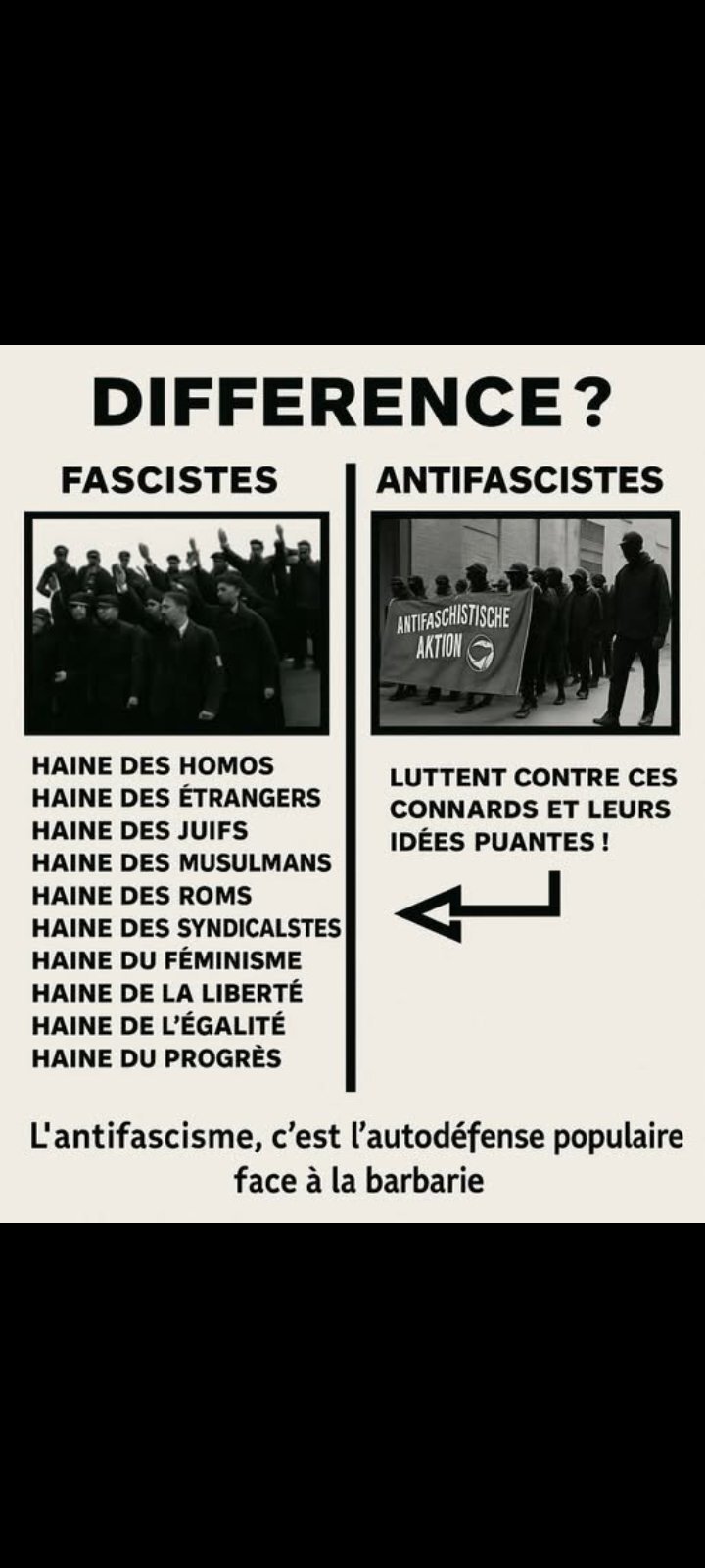 La radicalité d'extrême droite et d'extrême gauche sont au même niveau, mais ils ont une seule différence dans la violence : le courage, les droittardés rêveraient de tuer du gauchiste, mais ce sont des lâches, ils préfèrent se cacher derrière leur écran d'ordinateur![]()