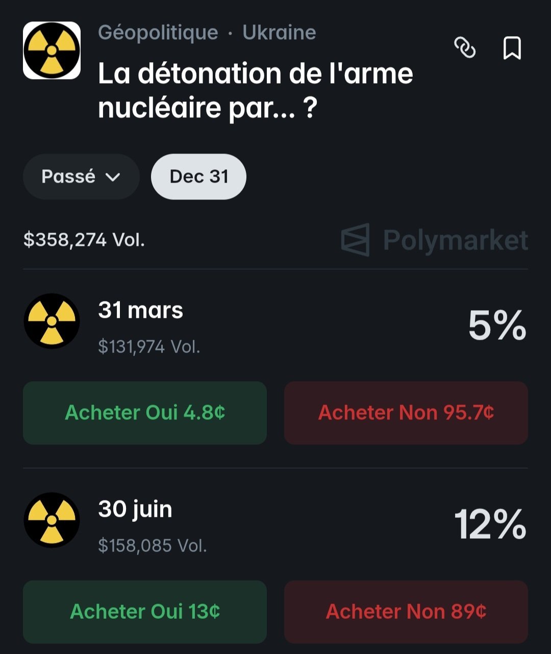 Ayaa mais comment vous faites pour tous être autant sous doué ? Qu'est-ce qu'il raconte l'op avec son apy ? Tu te dis pas que c'est étrange que selon ton interprétation l'échéance la plus court terme, donc moins probable, soit moins rentable ?5% c'est le pourcentage de personnes qui achètent du YES. Logique que ça monte plus l'échéance augmente.