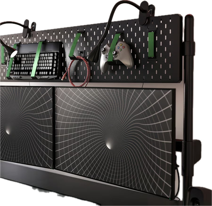 J'aime bien le principe de la structure qui porte les écrans https://www.ikea.com/fr/fr/p/malomrade-bureau-gamer-assis-debout-avec-bras-decran-electrique-noir-50585805/#content