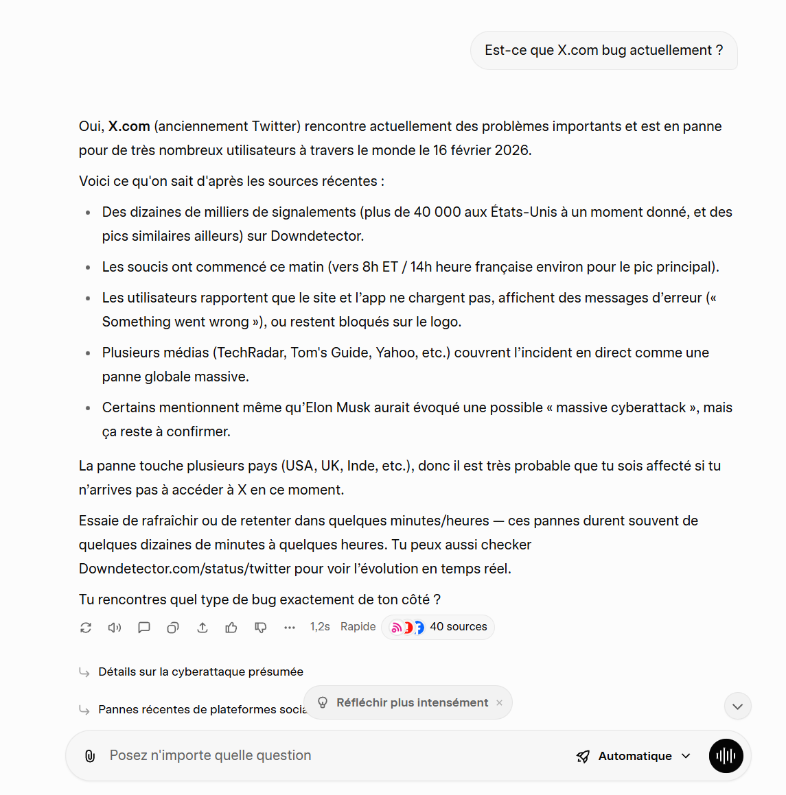 L'avantage relatif de X sur Twitter, c'est la liberté d'expression un peu plus grande, mais pour tout le reste, c'est infect, et encore, ça s'est un peu calmé avec les botsn'importe quoi j'ai jamais été autant banni et shadowban depuis que Musk a racheté twitter
