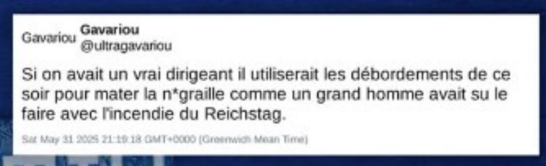 : « Musulmans de merde race de merde » ; « Dégage sale bougnoule » ; « Race d’envahisseurs » ; « Un bon nègre c’est du jus d’esclave » ; « En 2027, on les balance tous à la mer », ou encore, à propos de l’eurodéputé de gauche Raphaël Glucksmann : « Il fait chier le youpin gluant ».