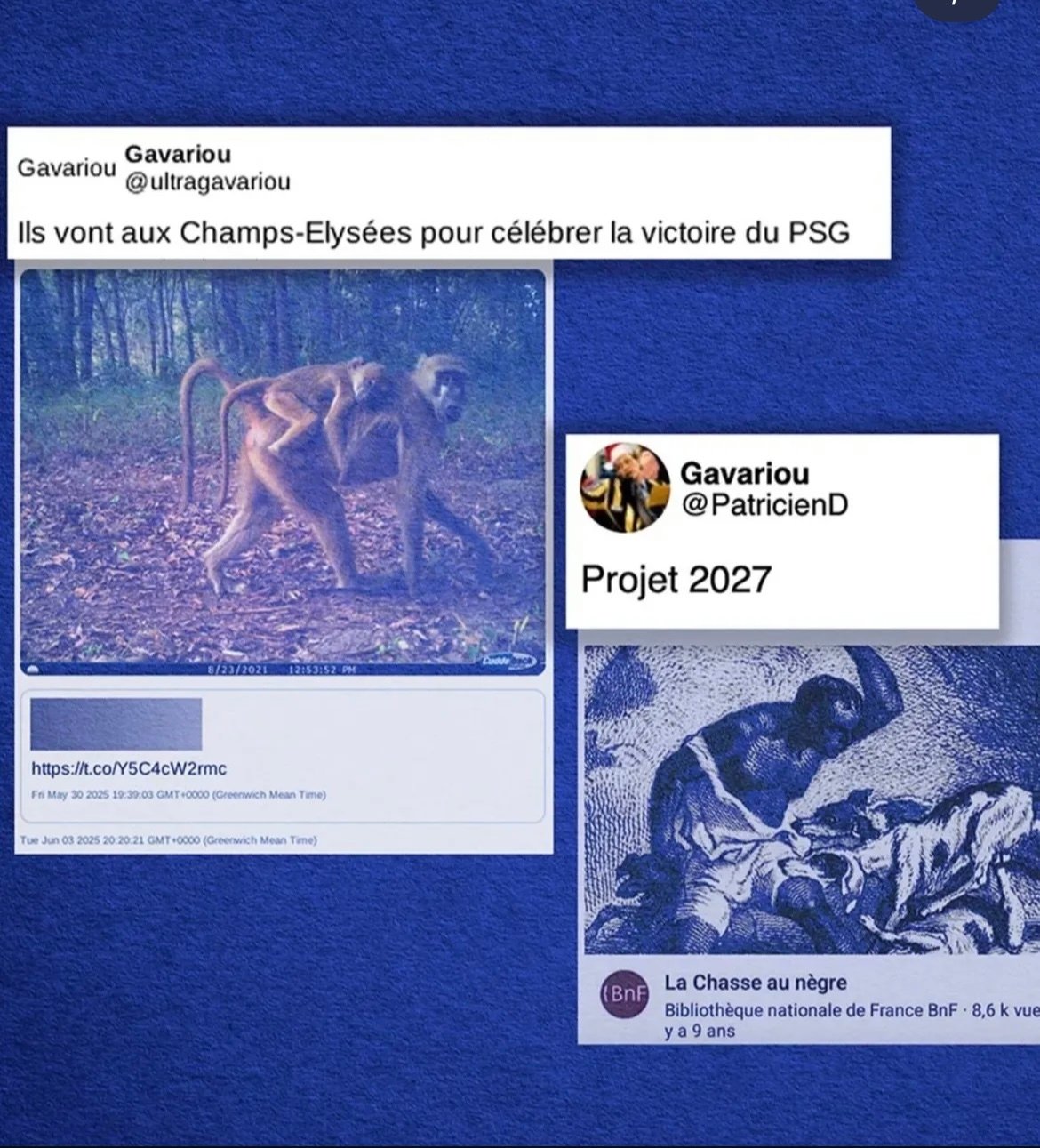 Alors qu'elles tentent de quitter les lieux, les victimes subissent une chasse à l'homme raciste. Les agresseurs avinés dont un élu municipal et le président de la société de chasse locale, les poursuivent dans un pick up en continuant à les insulter, hurlant <la chasse au n** est ouverte».Décembre 2025, Nice.
