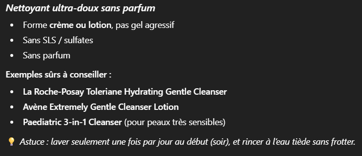 Hmm ChatGPT te conseille un nettoyant ultra doux sans parfum ainsi qu'une hydratation très minimale pour commencer.
