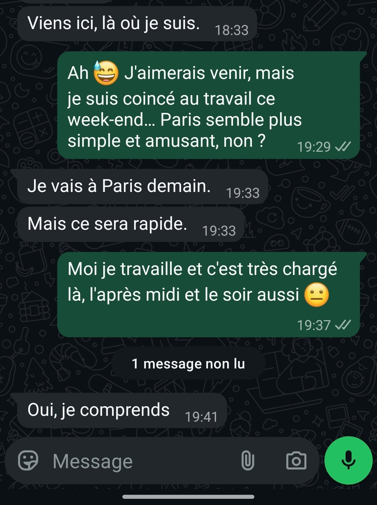 Sauf que 2 jours après c’est elle qui me recontacte sur WhatsApp. On discute de voyages, bouffe, etc. Elle m’envoie parfois des photos. Je lui propose un resto quand elle reviendra sur Paris, elle dit oui. Le truc c'est qu'elle ne parle jamais de temps, d'argent ou de rdv.
