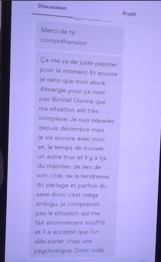 En plus j'ai passé toute la conversation à dire qu'on semblait pareil, j'ai même deviné direct son MBTI grâce à son profil (on est INFP-T tout les deux), vraiment j'ai surfé sur le match j'ai été introllable puis vla ce putain de message jpp