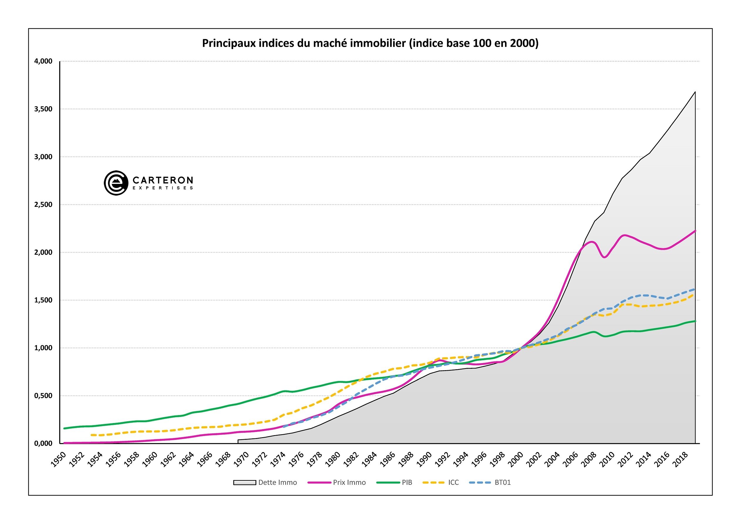 Le graphique nous montre parfaitement, que, jusqu'aux années 2000, le prix de l'immobilier était corrélé au pib. Le bt01 et icc = coût de construction.
