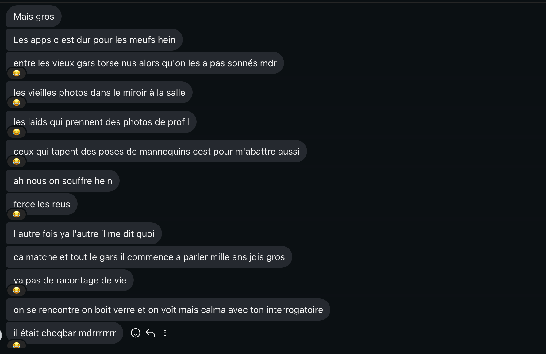 sur ces applis, les meufs de valeurs restent 1 a deux semaines grand max, il reste que les cas sociaux de tout bords