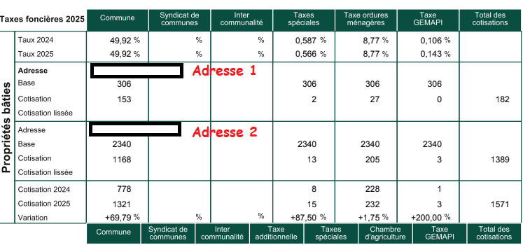 Dans la taxe foncière de mon propriétaire, je constate deux adresses, une qui correspond à mon logement et une autre dont je ne connais pas l'origine (et qui se retrouve à 2 numéros du miens). L'adresse 2 sur la photo étant la mienne. La TEOM 2025 est un cumul des deux logements.
