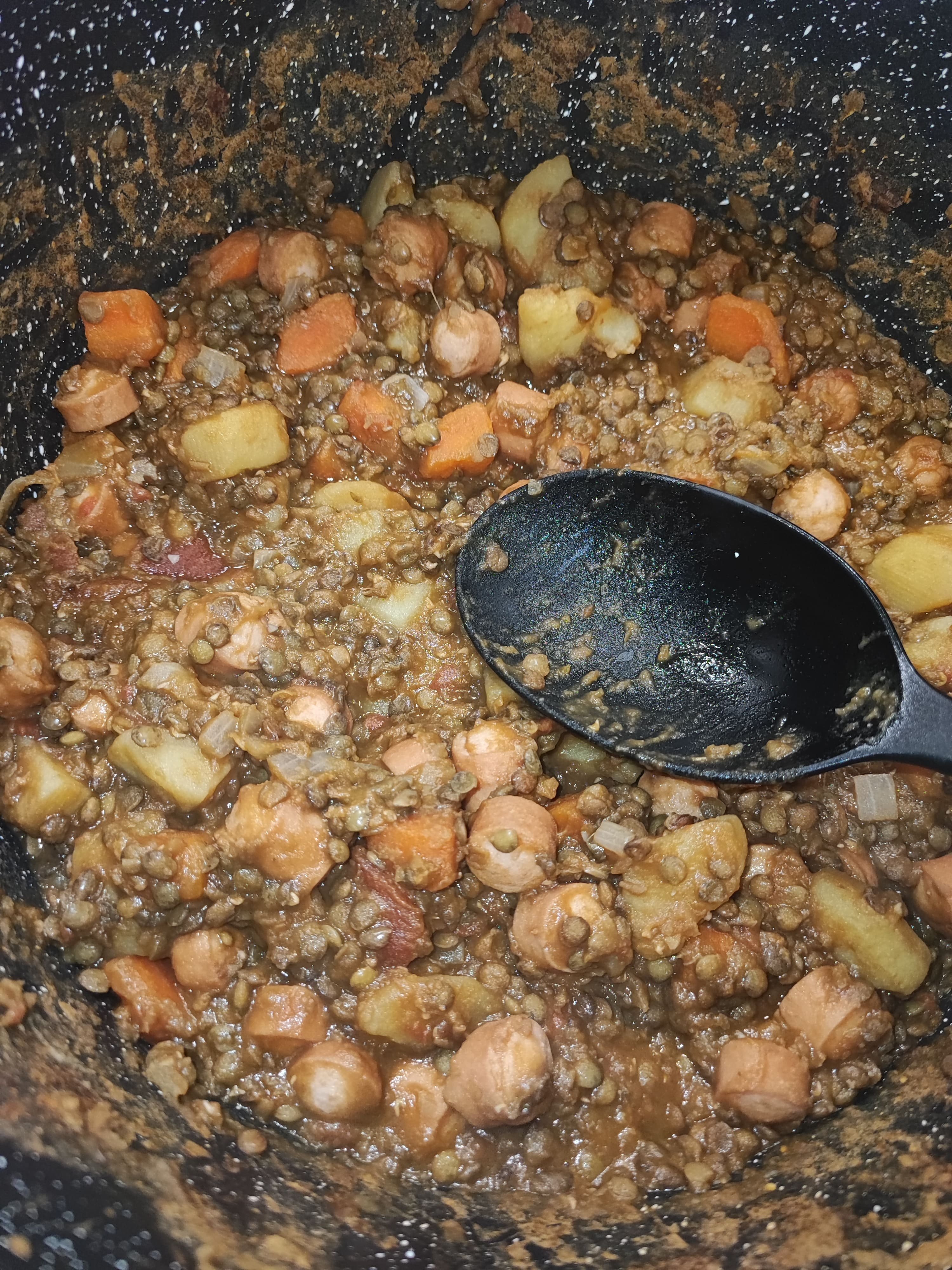 - puis vous versez le bocal de tomates pelées, le cube de bouillon de légumes, les patates en petits morceaux, les lentilles sèches et les carottes.