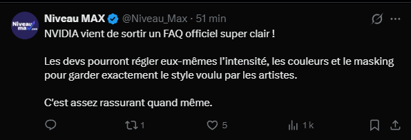 Sur Starfield ça rend bien car les visages sont horribles, mais sur RE9 je préfère largement ceux du jeu de base. Alors ok, tout semble plus réaliste... mais c'est également plus fade et générique. Je n'ai pas envie d'avoir un filtre IA qui fait que tous les jeux se ressemblent. Puis ce sont surtout des jeux bien optimisés avec une vraie DA et un bon gameplay qu'on veut.
