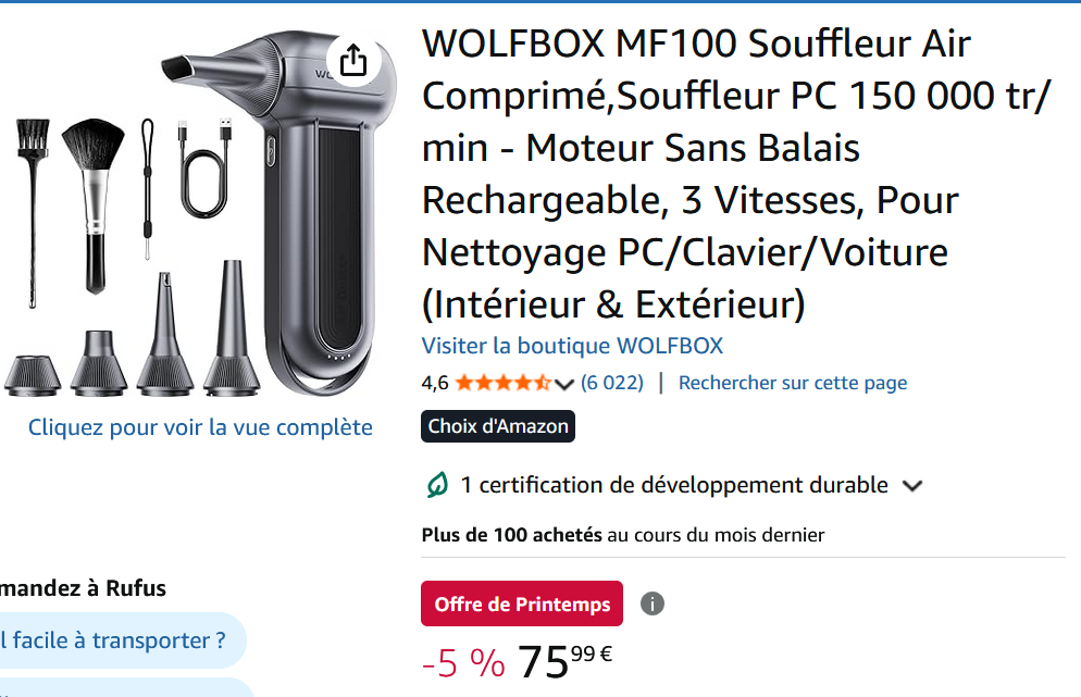 Le 14 mars 2026 à 22:29:45 : moi j'en ai un acheté 20 balles sur aliexpress 10 000 mah de batterie je le recharge une fois par an, ca souffle vraiment super fort je dépoussière des pc qui ont accumulé 15 ans de poussière en 1 minute
