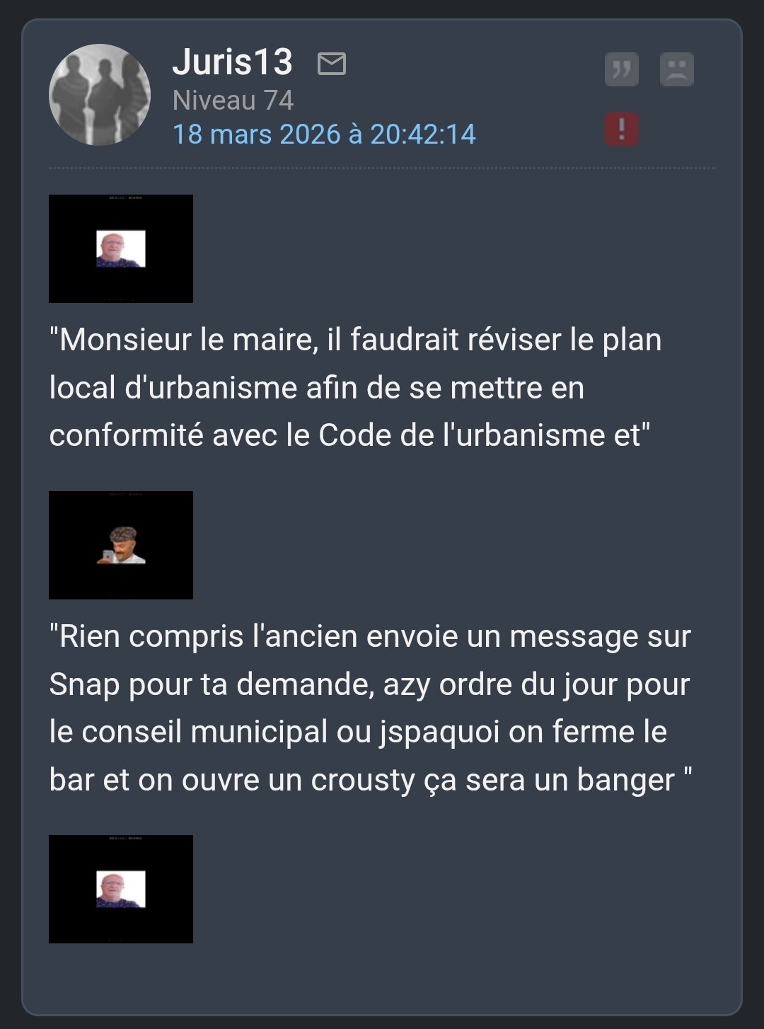 "Rien compris l'ancien envoie un message sur Snap pour ta demande, azy ordre du jour pour le conseil municipal ou jspaquoi on ferme le bar et on ouvre un crousty ça sera un banger "
