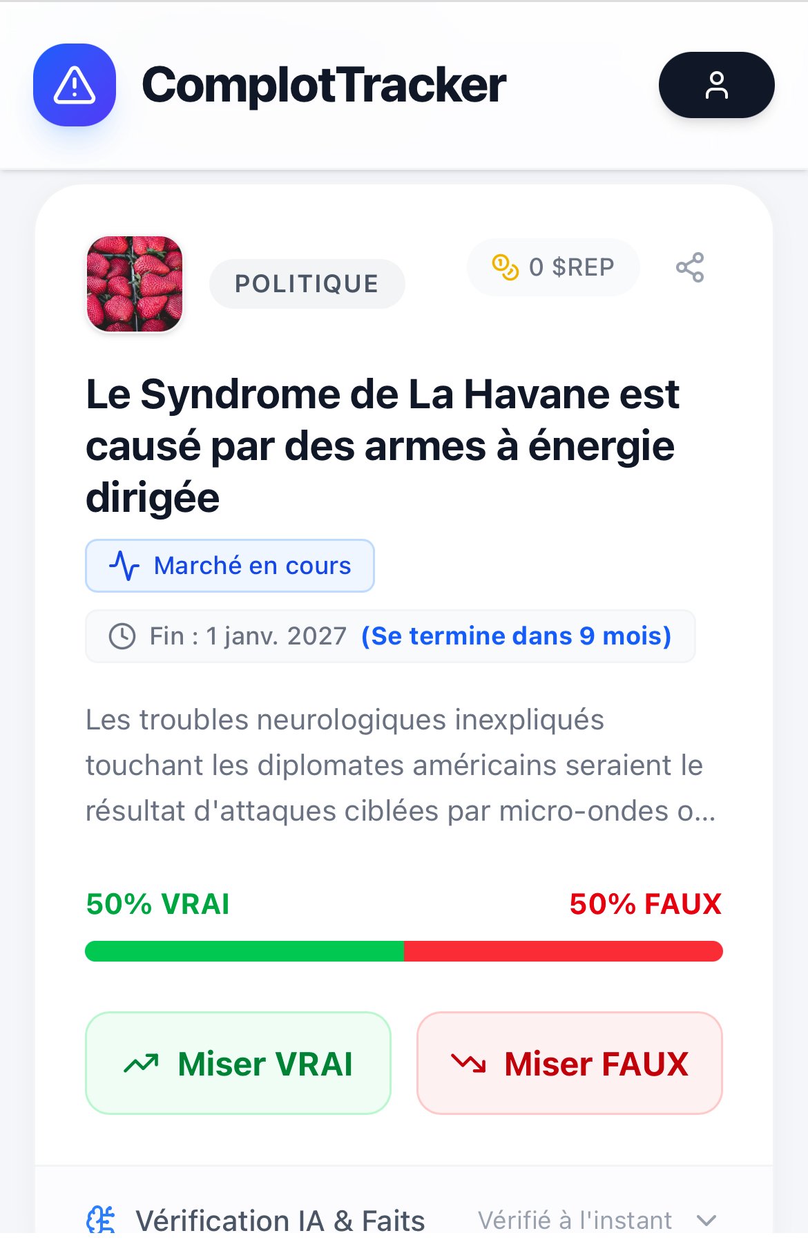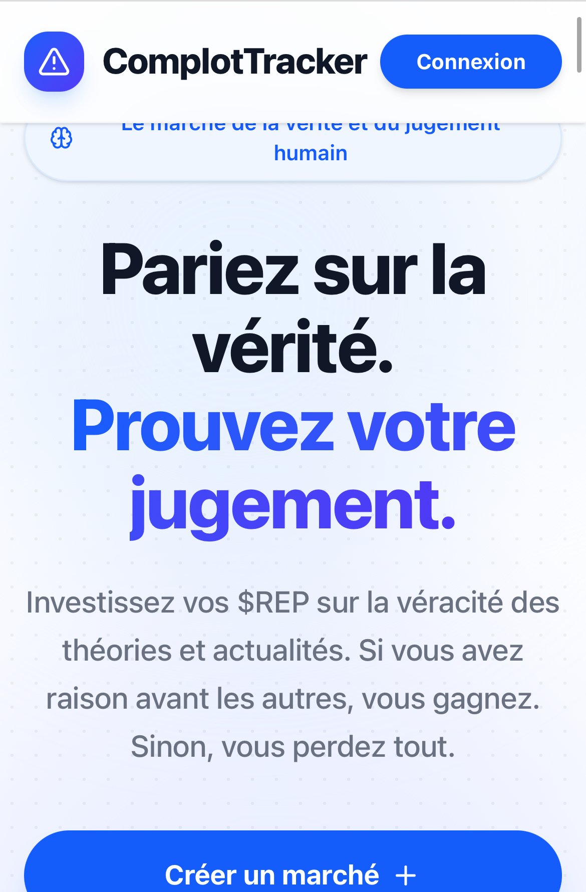 > > > > > > > > Là je fais un genre de polymarket sur le complot. Lassé d’entendre systématiquement « les complotistes ont toujours raison » « on vous l’avait dit », ça ajoute les complots à la « mode » (et quand ça sera public, n’importe qui pourra en ajouter), c’est daté. Une IA + une API News Check 1x par jour s’il y a une information officiel qui va dans le sens d’un complot. On pourra enfin calculer le nombre de prédictions complotistes vrais, et fausses, et qu’est-ce qui était vraiment prédit, et quand, et quel poids (enfin ça, c’est si je le lance vraiment