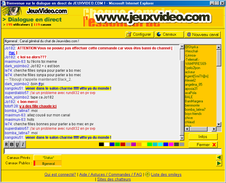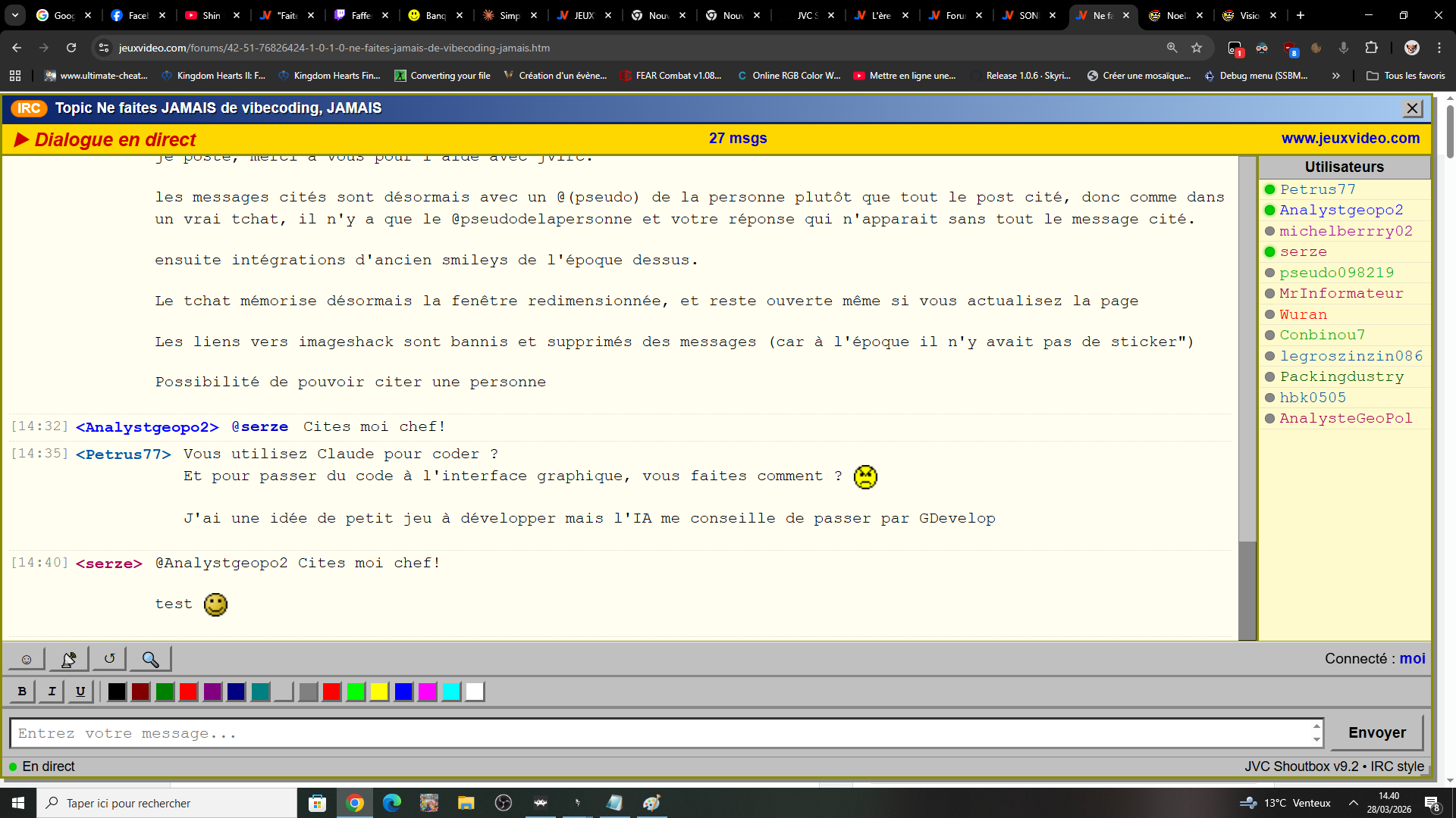 Salut !Pas mal d'améliorations avec le tchat irc, maintenant le tchat n'actualise plus la page après chaque message que je poste, merci à vous pour l'aide avec jvirc.