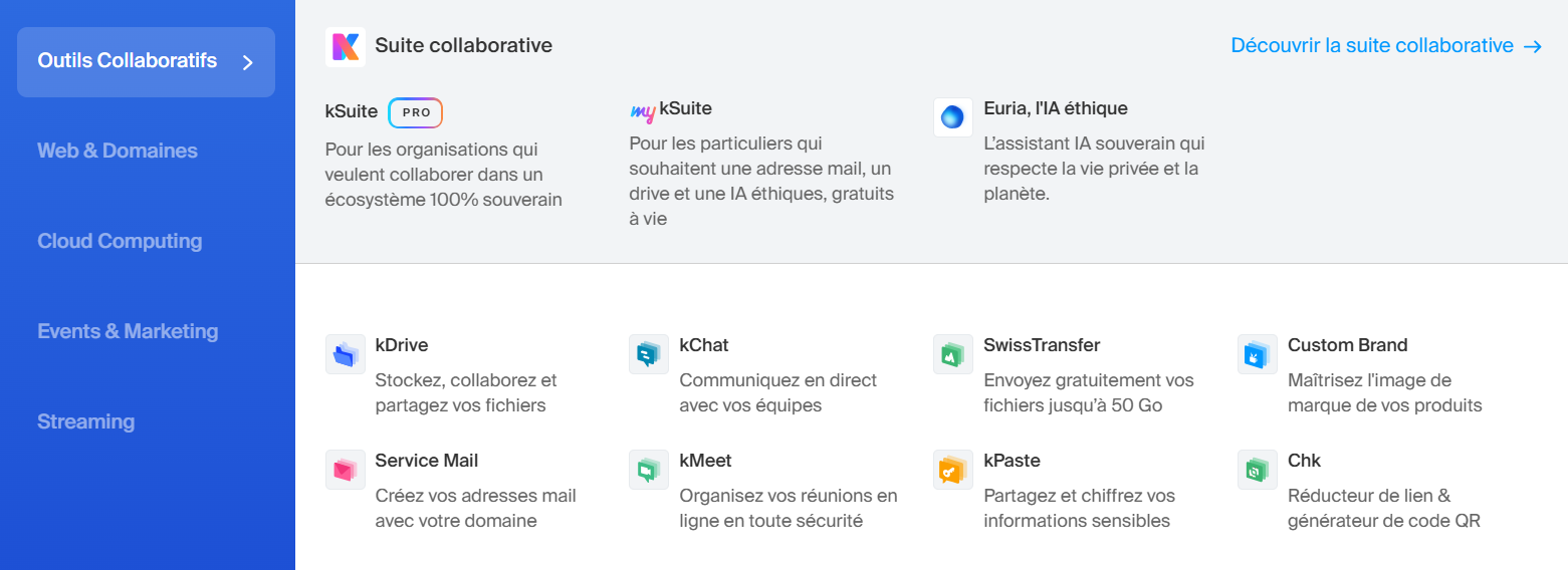 kDrive c'est l'alternative de Google Drive, kMail c'est le comme gmail etc..