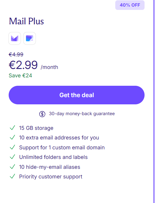 La ou Infomaniak donne pas de VPN mais donne le mail illimité + 3TO pour 3 euros je croisC'est toi qui vois de quoi t'as besoin, perso j'ai le unlimited à 8€/mois (faut attendre des event genre black friday ils cassent les prix) avec vpn, drive, calendrier, mail, password manager. Ca peut paraître cher mais c'est le vrai prix si tu veux une société qui ne vend pas tes données pour se faire du fric + tout est ultra secure + chiffré + interface ultra belle et moderne + 0 (zéro) bug en 5 ans + fonctionne parfaitement sur smartphone