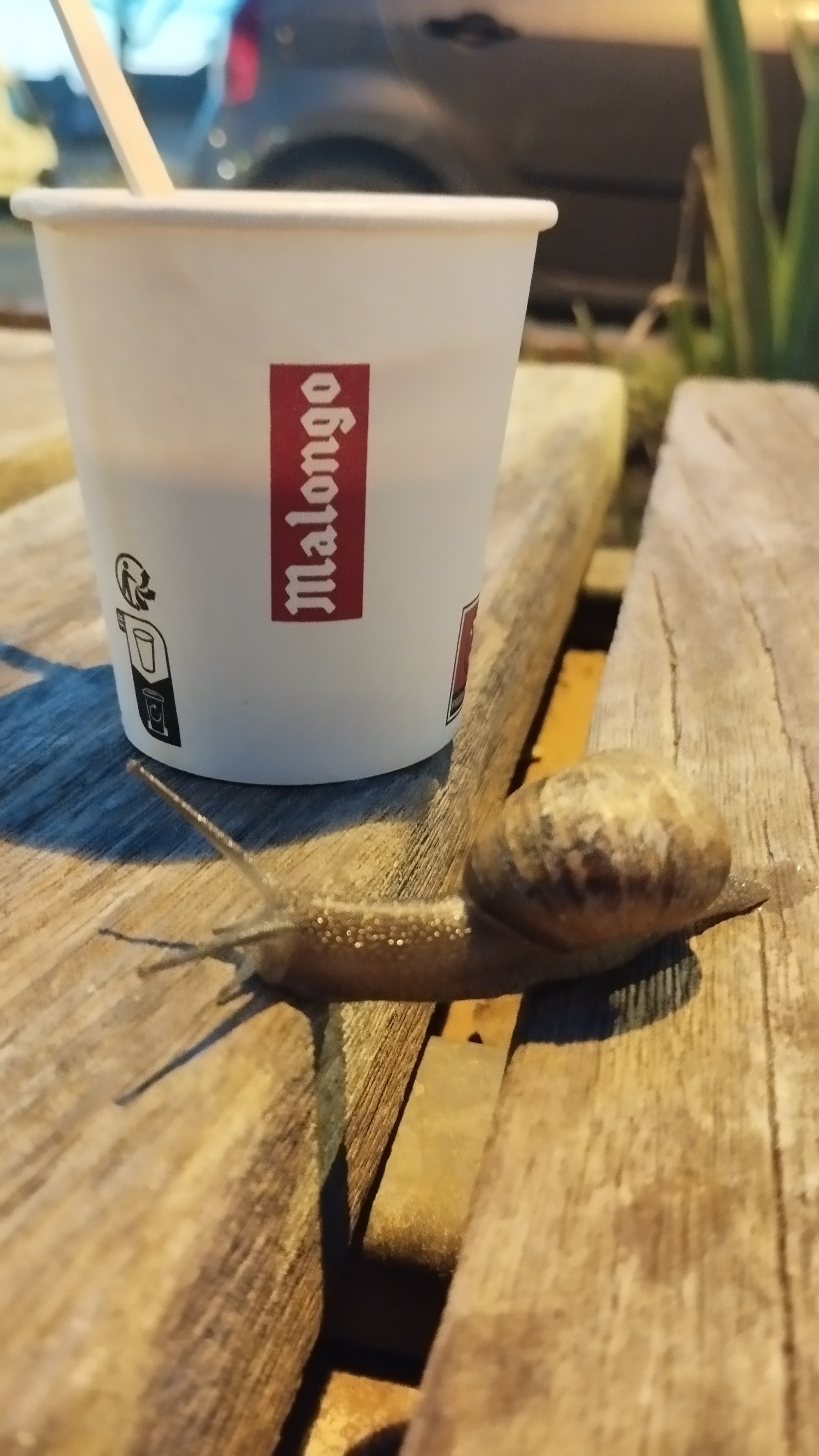 Une surprenante compagnie s'est présentée ce matin, sur mon banc habituel où je bois mon café : un escargot sauvage !