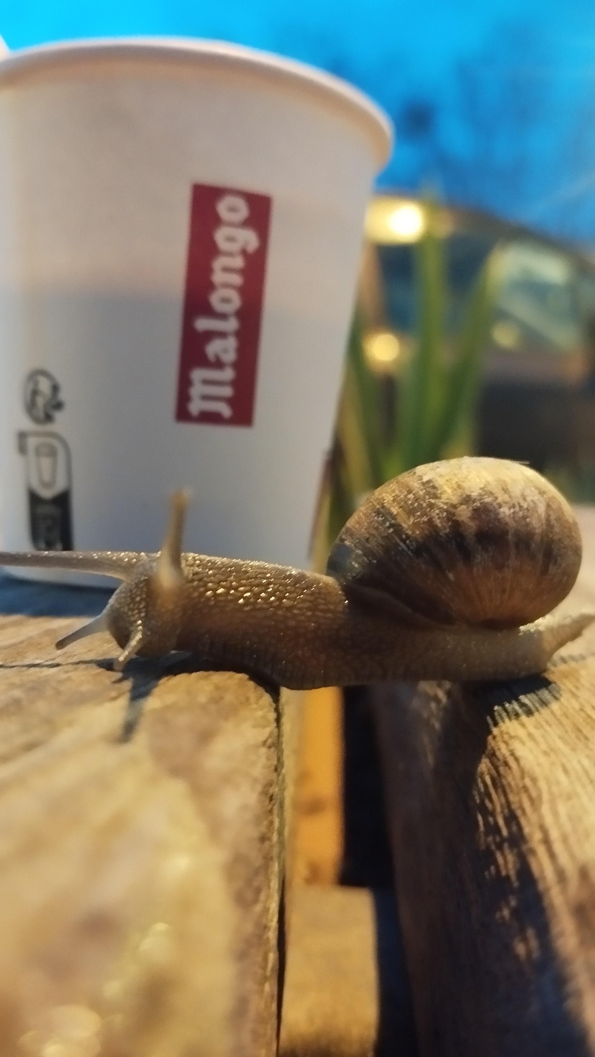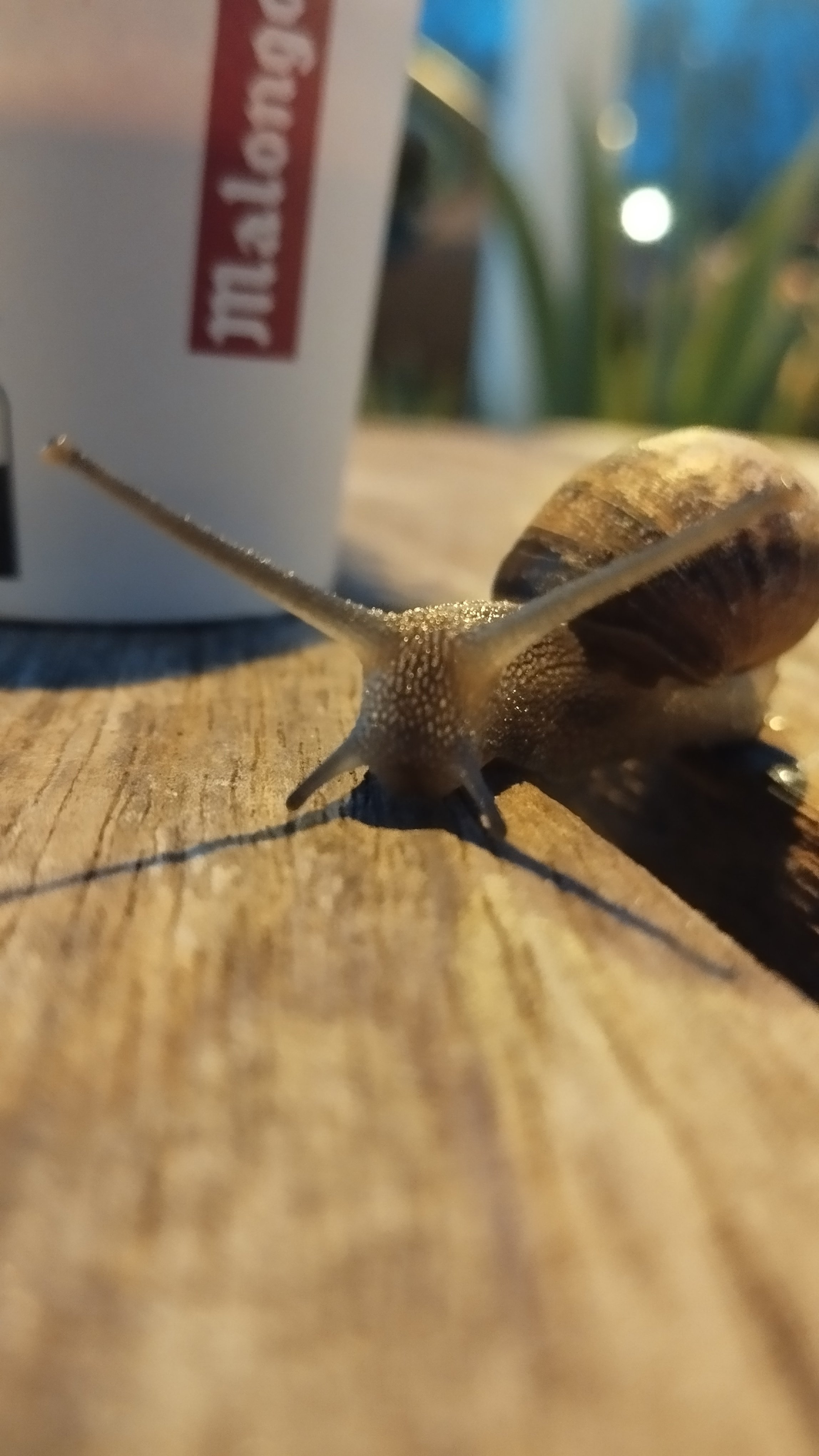 Une surprenante compagnie s'est présentée ce matin, sur mon banc habituel où je bois mon café : un escargot sauvage !Il a accepté de prendre la pose
