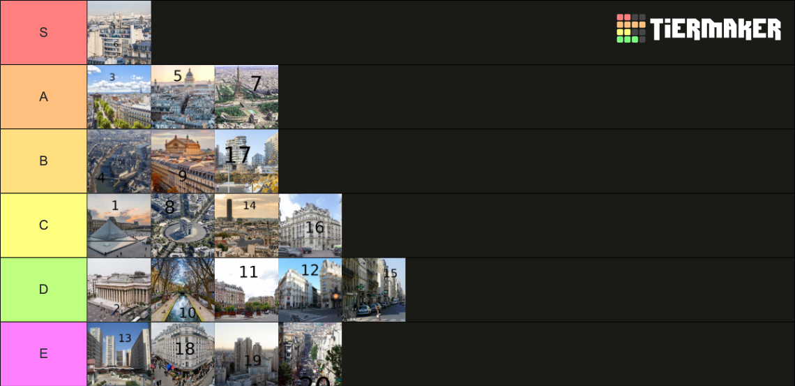 C'est vrai qu'en soit le 14 c'est même niveau que 15 et 12. Mais vu que j'y habite y'a quand même un affect, et je trouve qu'il est légèrement au dessus des deux que je viens de citer, ne serait-ce que de par sa position plus centrale dans Paris.