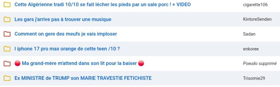 Le 01 avril 2026 à 22:23:27 :Le 01 avril 2026 à 22:20:38 :Il y a des délires ici de plus en plus limitesMais certains pourraient y croire, là est le problèmeUn forum normal avec des gens normaux