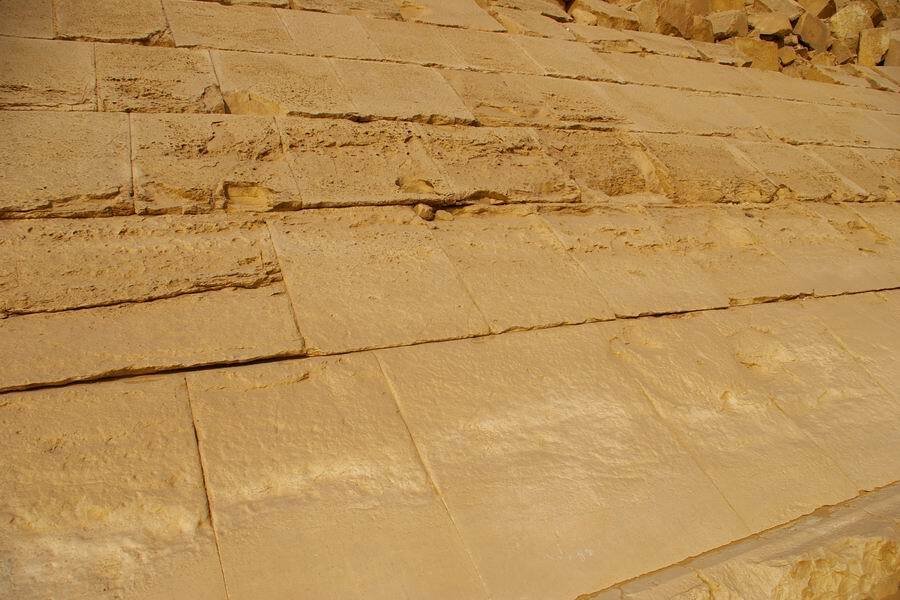 Principe : Le calcaire de Gizeh est mélangé à un liant géopolymère (eau, natron, argile kaolinite) pour former une pâte moulée et durcie en bloc.