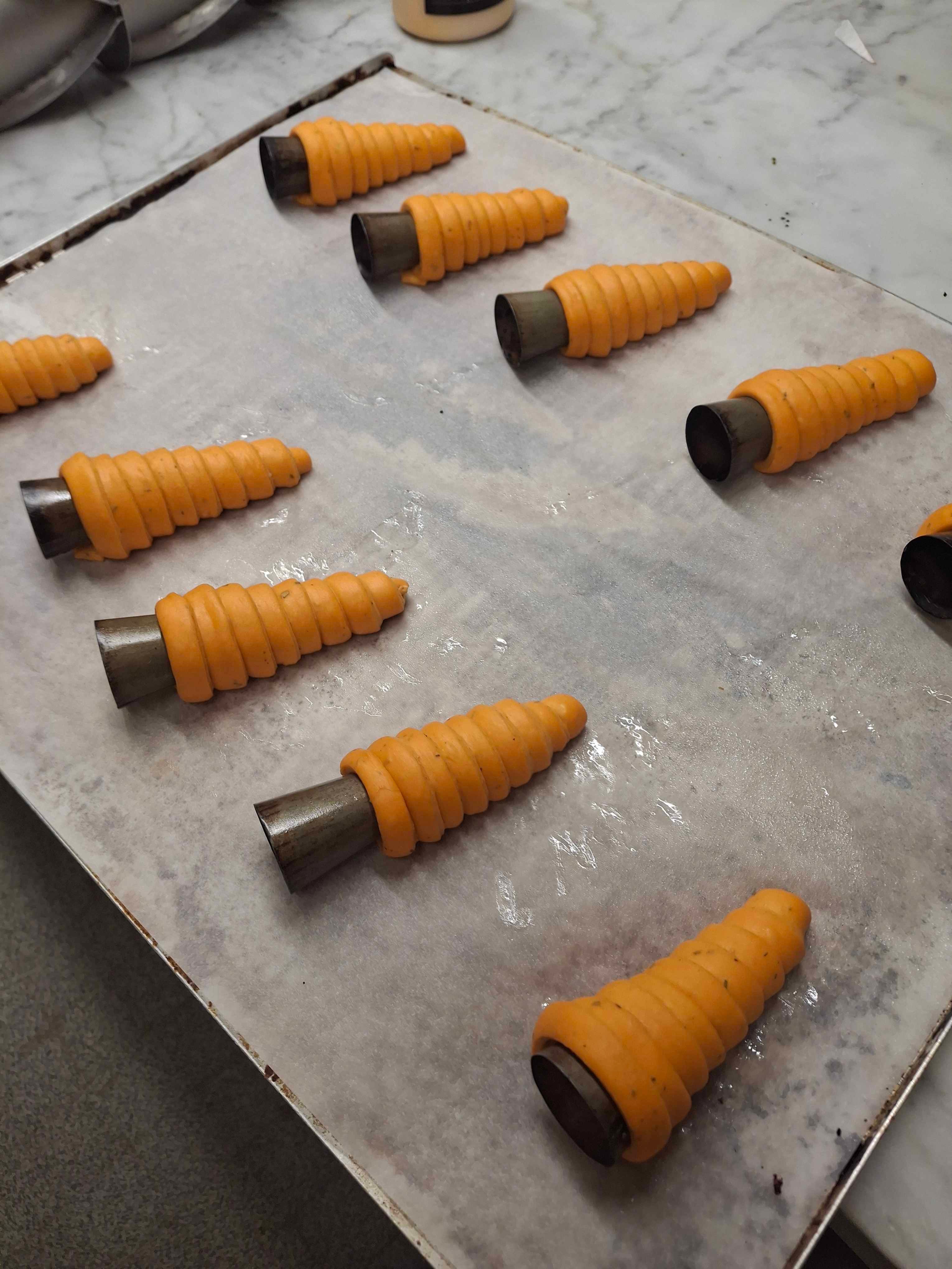Du coup j’ai fait une viennoiserie en forme de carotte avec une pâte feuilletée à base de jus de carotte et du basilic à l'intérieur