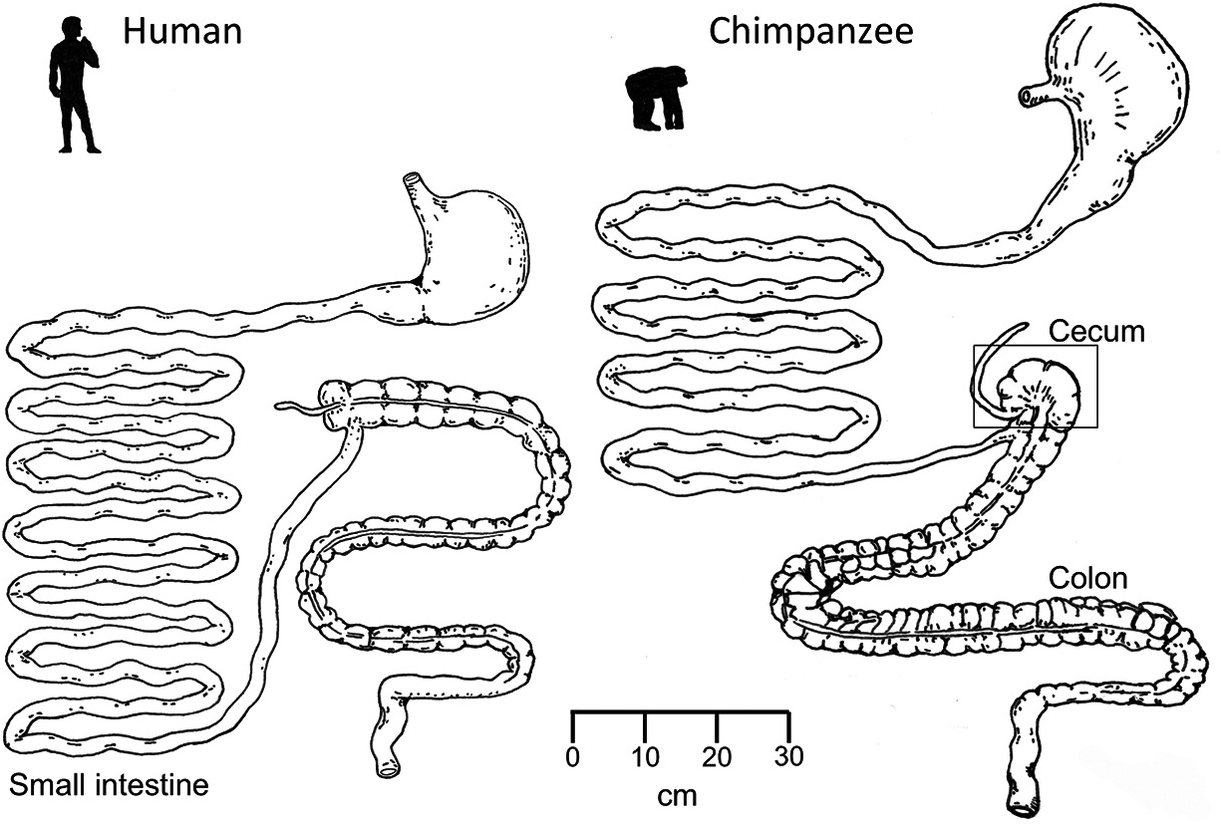 Encore faux. Chez l'Homme on a un intestin grêle long et un colon court, chez le Chimpanze il y a un intestin grêle court et un colon long.