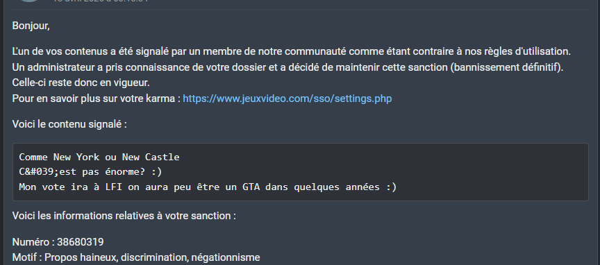 Doit pas y avoir de modos. C'est des bots qui ban à partir de mots clés dès qu'il y a un signalement. Y'a aucun humain derrière les bans.Les bots ne comprennent pas les degrés, et il n'y a absolument rien dans mon message qui prête à ban et encore moins définitivement.