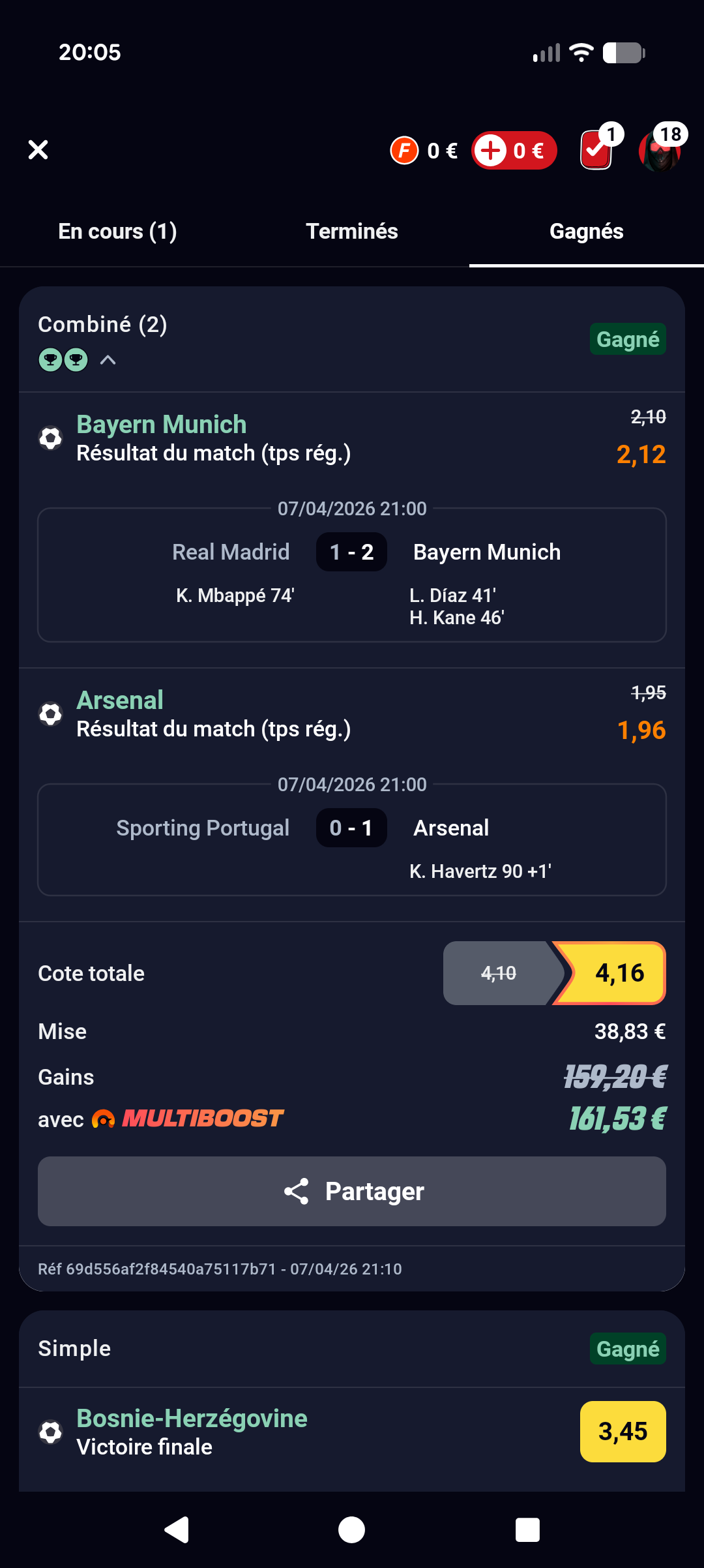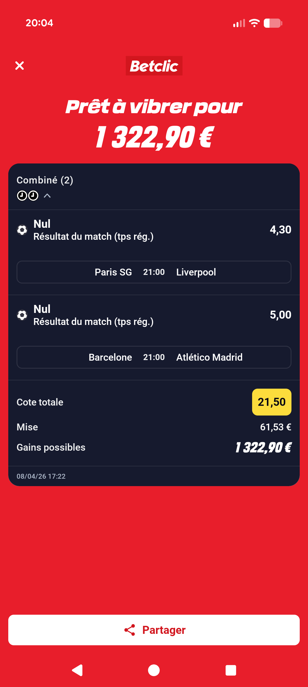 Et voila ce que je parie aujourd'hui sachant que j'ai retiré 100€ du compte et que j'ai parié le reste