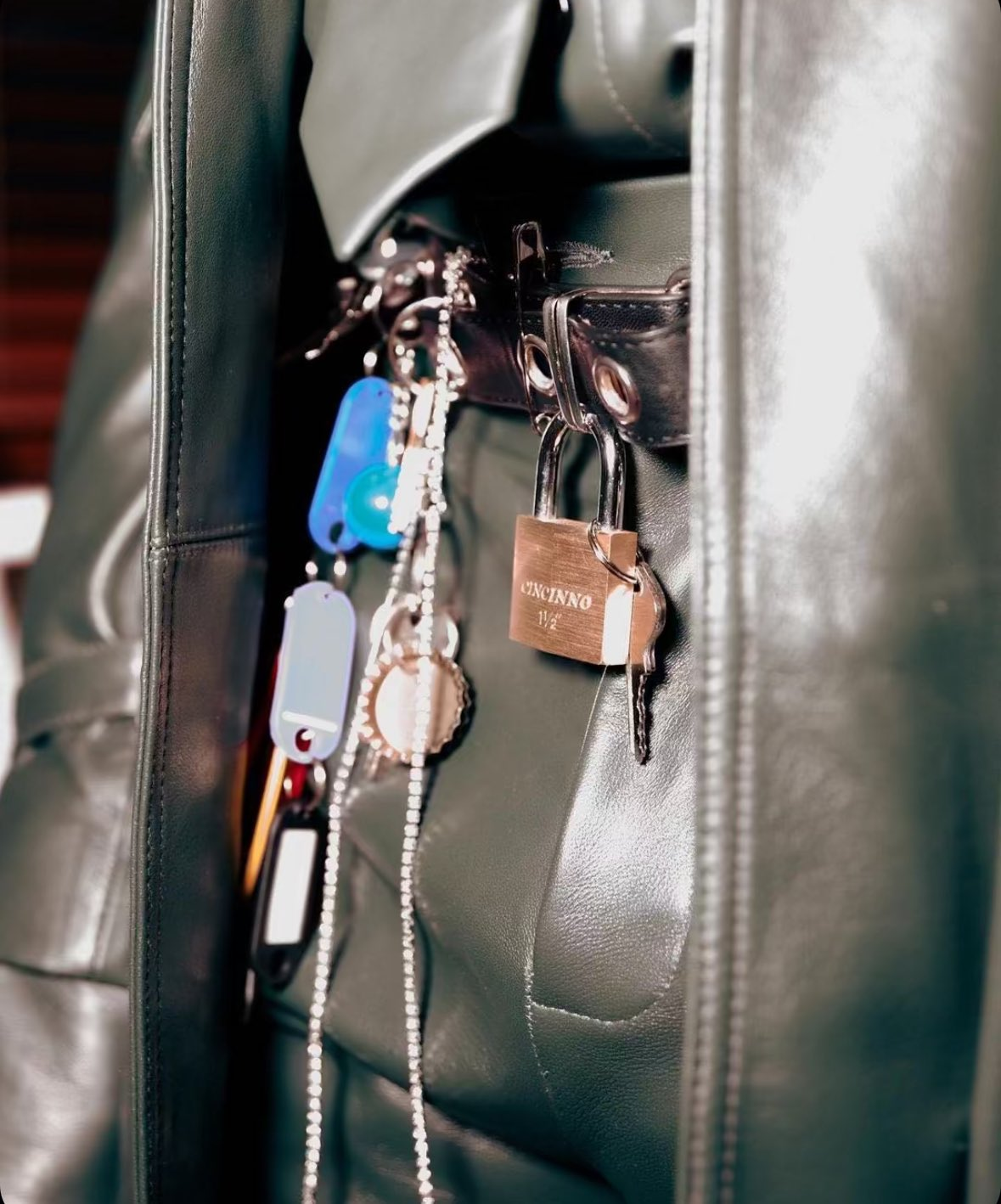 Il porte toujours un cadenas se sureté en laiton avec une clef accroché à la hanse, sur la boucle avant de son pantalon, comme ça un peu (mais pas sur sa ceinture, sur la boucle de son pantalon)