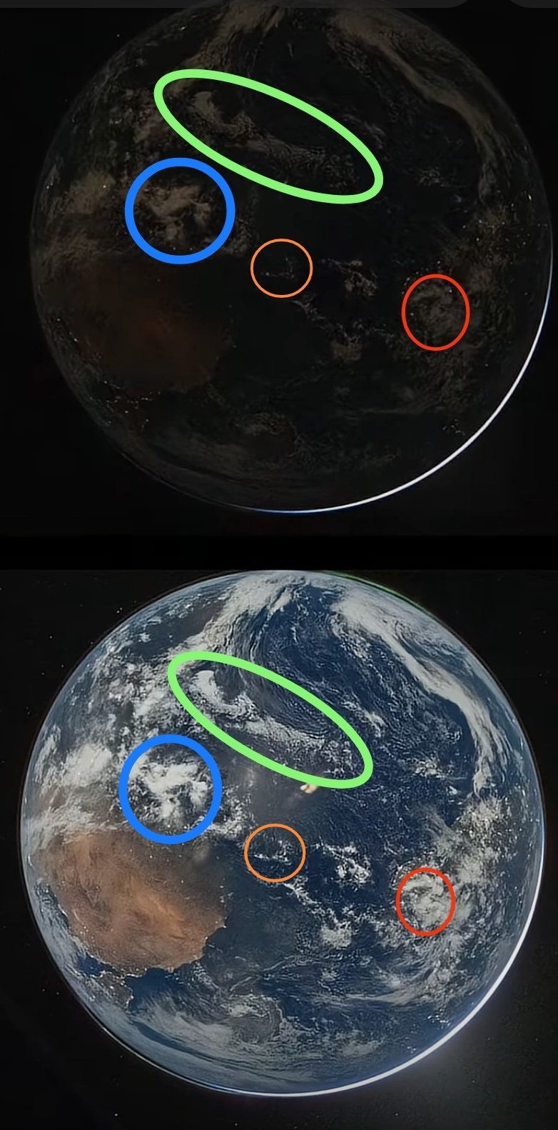 > >> >> >> Et visiblement tu ne vois pas que les deux "photos" de la Terre à 12h d'intervalle, donc une de jour et une de nuit, montrent les nuages aux mêmes emplacements et de mêmes formes. Ce qui est absolument impossible.